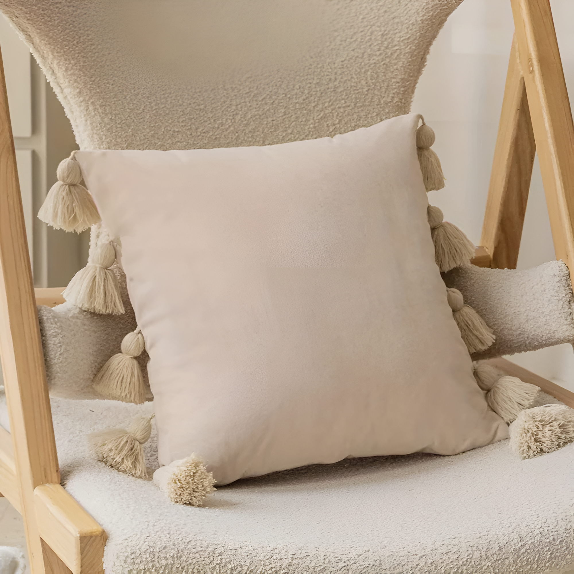 Add boho-chic charm to your space with this pompom cushion cover. Crafted from luxurious soft velvet and adorned with 10 handmade tassels, it’s both playful and elegant. Perfect for sofas, beds, or cars, its solid color design complements any décor.