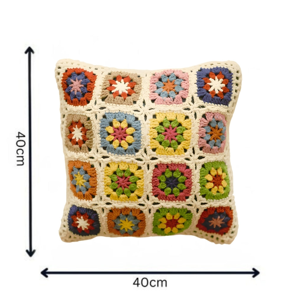 The Floral Crochet Cushion Cover seamlessly combines artistry and comfort, showcasing a vibrant multicolored geometric floral pattern that adds a lively, boho-inspired touch to any room. Carefully crafted from high-quality imitation cashmere, it offers a soft yet durable accent for your home decor.