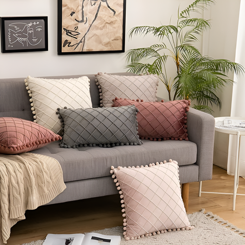 Enhance your home decor with Quilted Luxe Cushion Cover. Featuring a chic wool ball design, they add a modern touch to your sofa, bed, or couch. A stylish and effortless way to elevate any space.