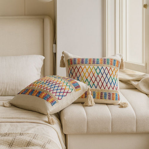 Brighten up your living space with the Rainbow Lattice Tassel Cushion Cover, where vibrant hues meet a textured lattice design. Crafted from a soft microfiber blend, it offers a cozy touch while enhancing your room with playful color and boho-inspired tassels.